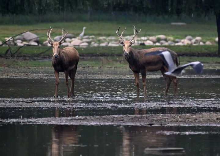 北京南海子麋鹿苑,一群头似马、角似鹿、蹄似牛的“四不像”正悠然踱步于湿地边,与掠过长空的鸟群构成一幅和谐的生命诗画。